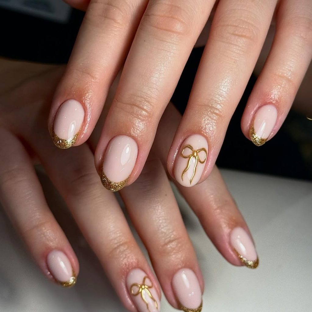 A sheer blush base is edged with sparkling Gold micro- French tip s, while two accent nails feature raised ribbon loops that look like jewelry. The oval silhouette keeps this Design light and elegant—perfect if you want holiday polish that still reads boardroom-ready.