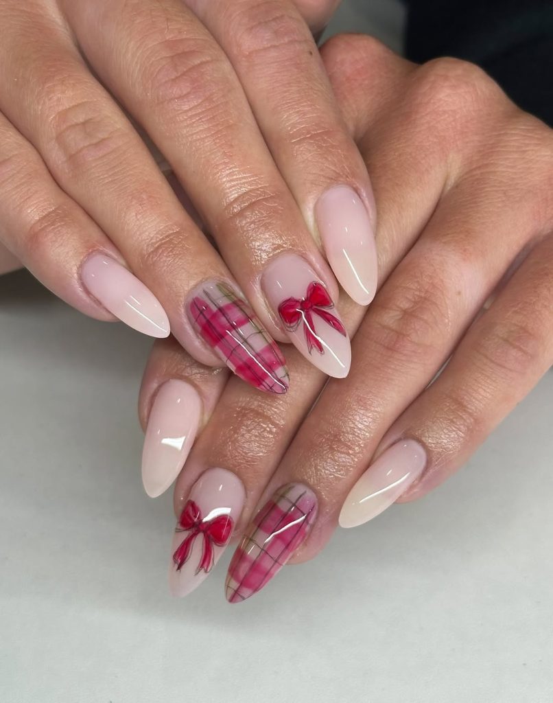 Glossy neutrals meet tartan “wrapping paper” panels and hand-painted Red bows that sit squarely in the spotlight. The elongated Almond shape makes the bow tails feel fluid and refined rather than cutesy.