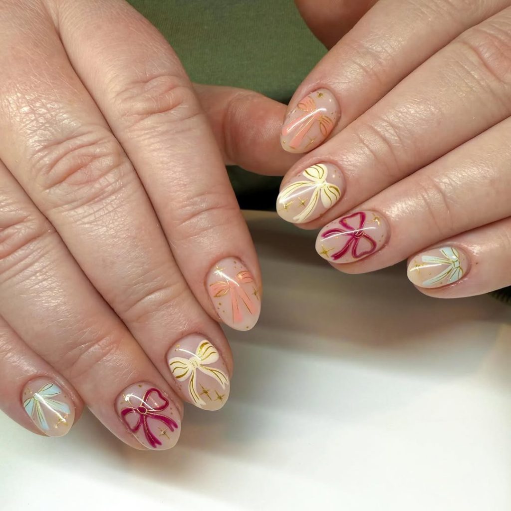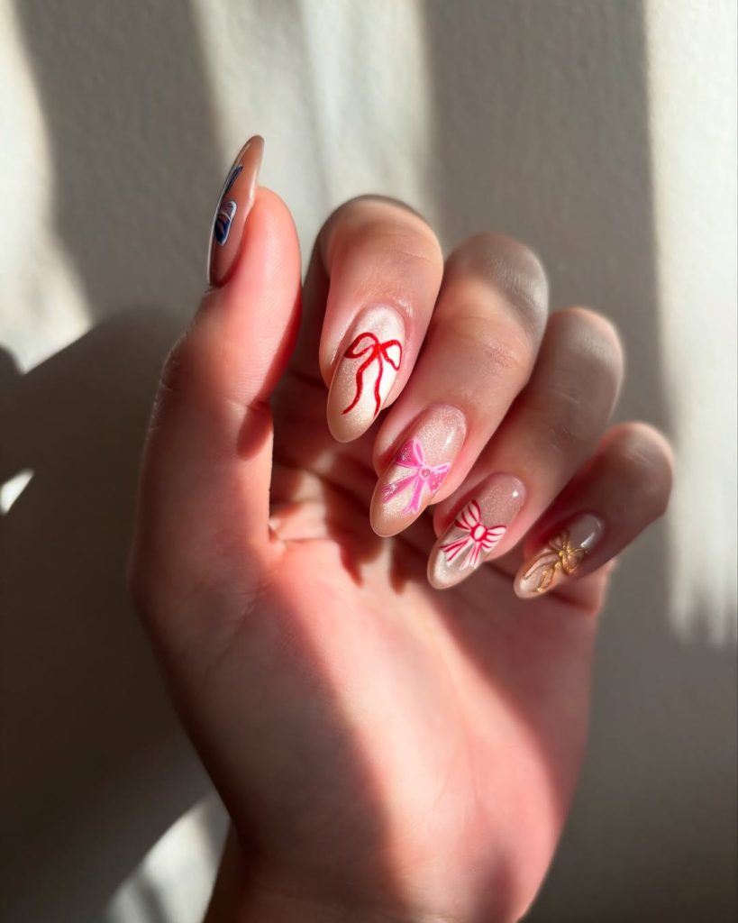 A soft, pearly base becomes a gallery of bows: cherry Red , ballet Pink , and a warm Gold outline. Each nail gets a different ribbon character, so the set feels collected and personal—like stickers on a favorite suitcase.