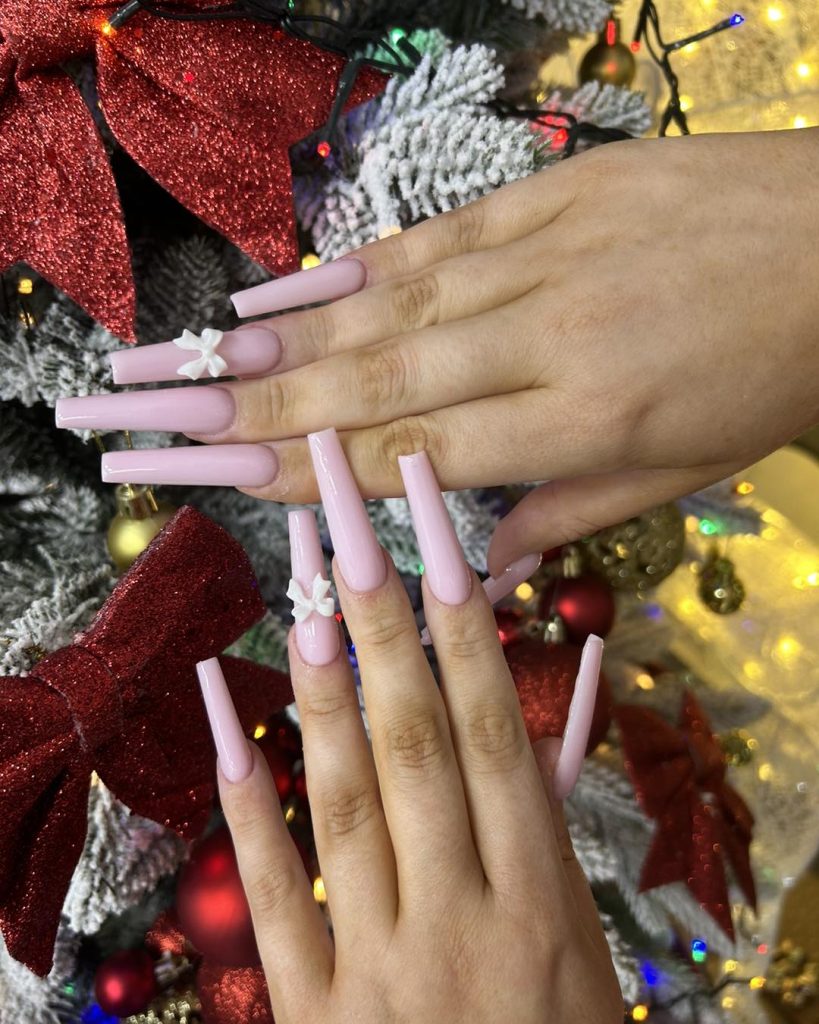 For maximalists: glossy baby Pink coffin nails topped with sculpted White bow appliqués on the ring fingers. The clean monochrome keeps the drama chic, not loud, and photographs like a dream under string lights.