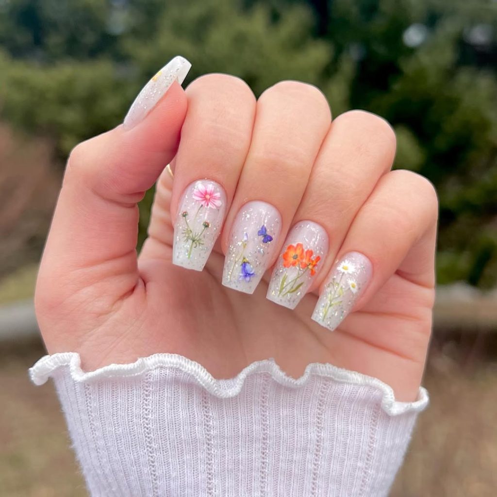 These translucent coffin nails feature hand-painted botanical motifs that feel light, airy, and seasonally perfect. The soft base allows the floral artwork to stand out without overwhelming the design. This style aligns with spring’s natural themes while maintaining a refined aesthetic. It’s a great option for women who enjoy expressive ideas but still want a manicure that feels grown-up and intentional. The look pairs effortlessly with flowing fabrics and outdoor spring events.