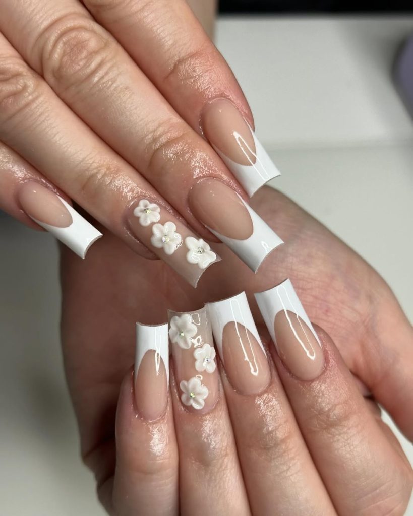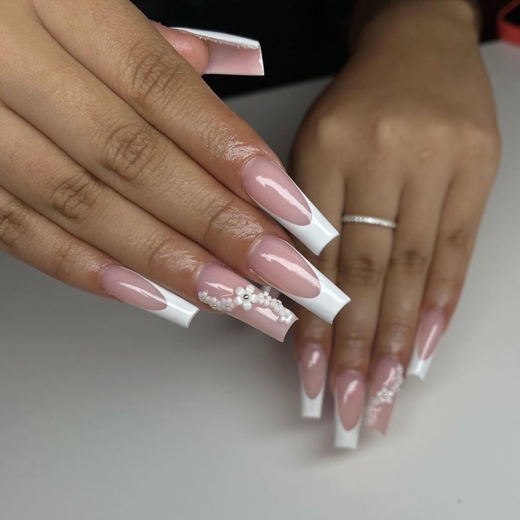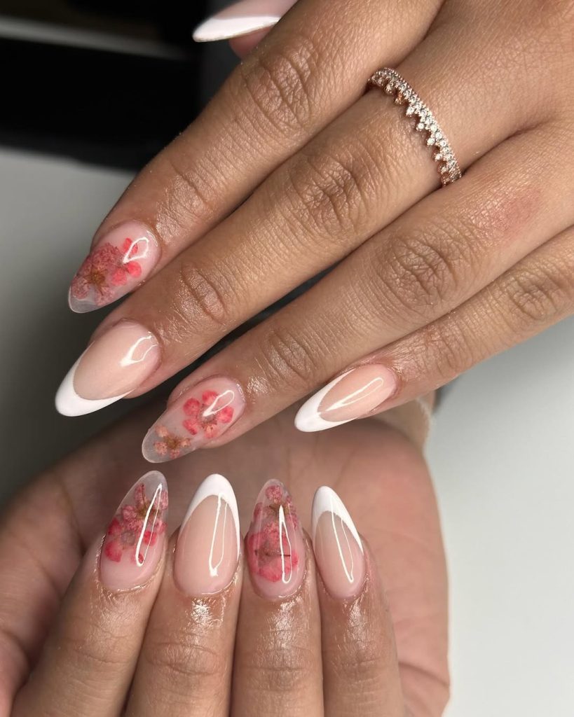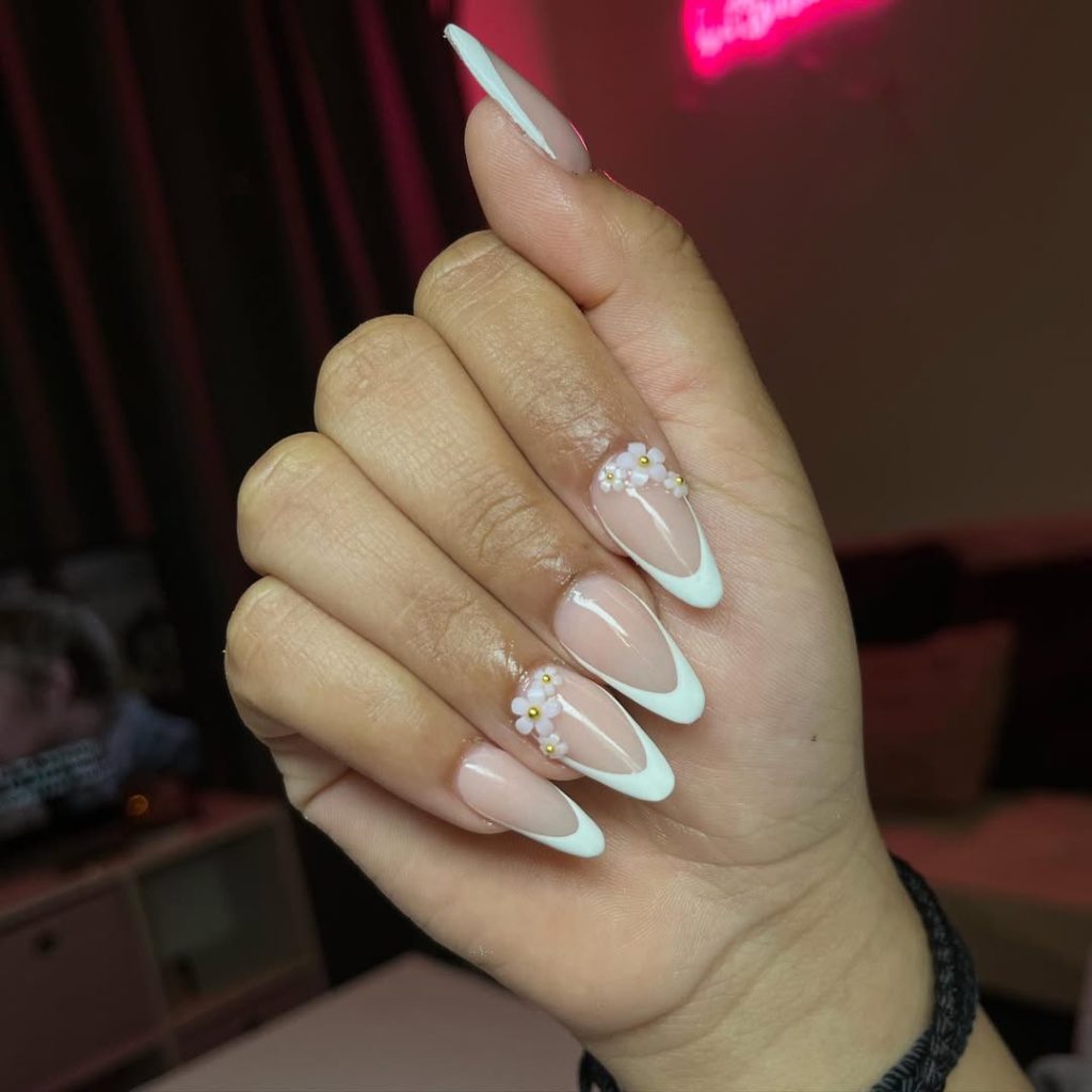 Sharp stiletto nails meet soft floral embellishments in this striking yet elegant design. The crisp white French tip contrasts beautifully with the nude base, while tiny floral details soften the dramatic shape. This manicure is ideal for women who love high-fashion silhouettes but still want a spring-appropriate softness. It pairs especially well with evening looks or statement accessories, aligning with the elevated nail trends highlighted by luxury beauty editors for 2026.