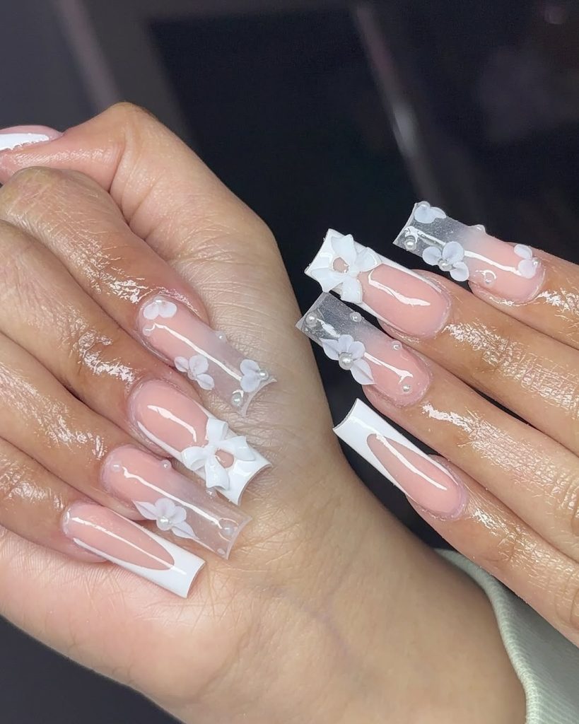 The design features a statement square French manicure adorned with 3D bows and blossoms.