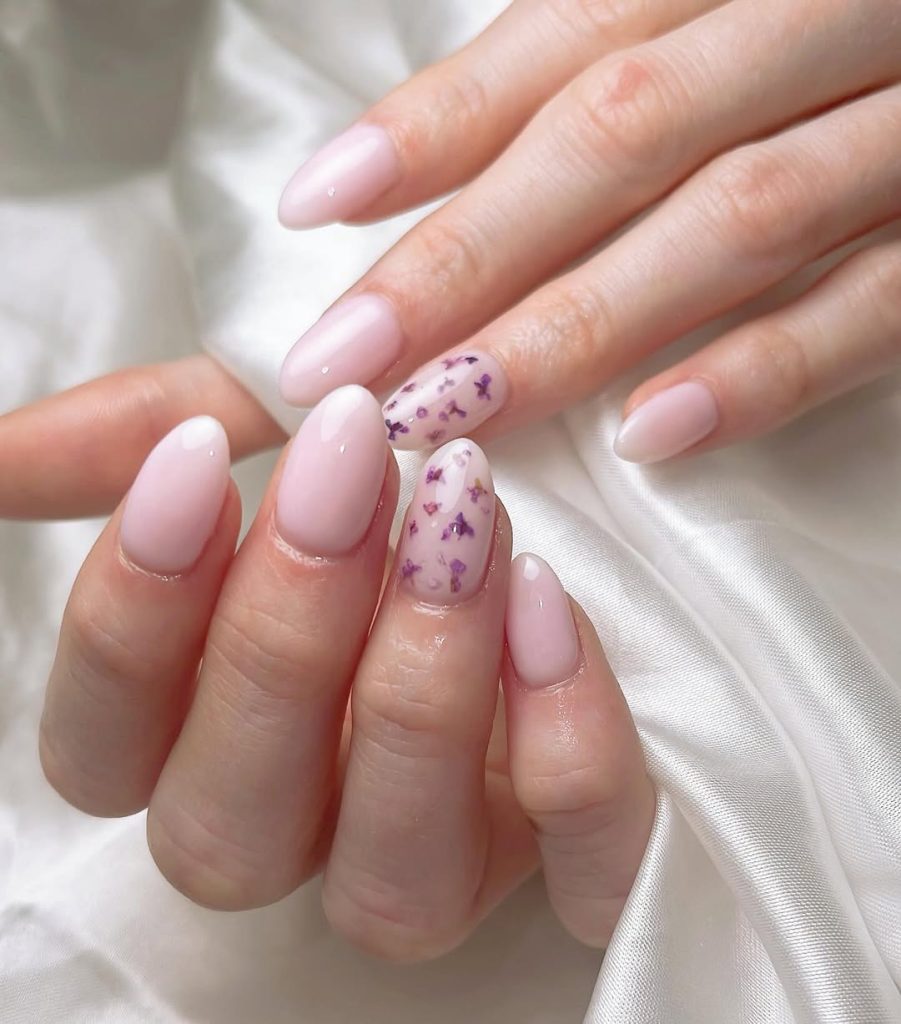This manicure leans into softness and romance, featuring almond pink nails with tiny embedded purple floral details. The design feels airy and almost weightless, aligning beautifully with spring’s lighter fabrics and pastel wardrobes. The almond shape keeps the look refined, while the floral inclusions add a subtle artistic twist. It’s an excellent choice for women who prefer simple elegance with a hint of individuality, proving that almond purple doesn’t need to look dull when it’s done right.