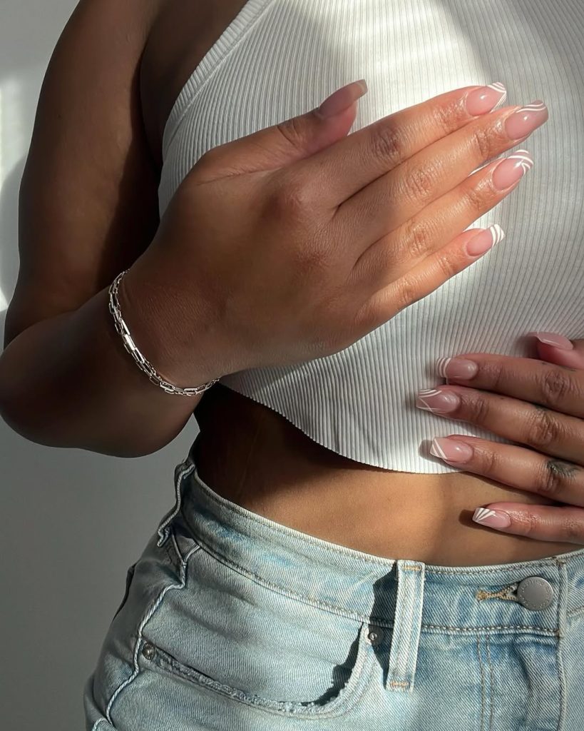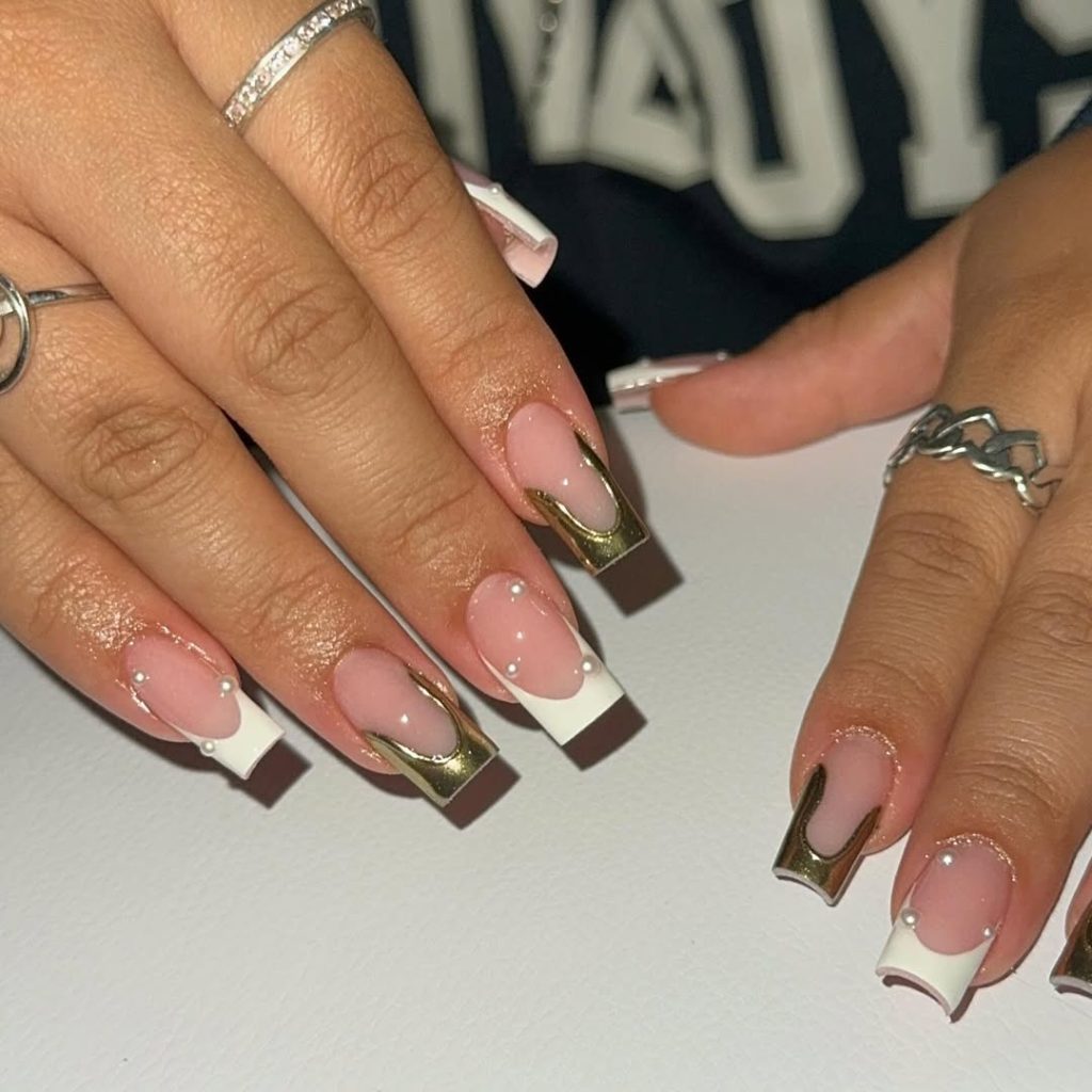 This look updates the traditional square French with sculptural gold contour detailing that frames the nail bed like fine jewelry. A soft blush base keeps the look wearable, while the metallic curves introduce a modern, architectural feel that defines classy spring nails 2026. The balance between clean white tips and warm gold accents makes this style especially striking in natural light. It’s an ideal choice for women who appreciate refined designs with a fashion-forward edge—perfect with neutral tailoring or minimalist gold accessories.
