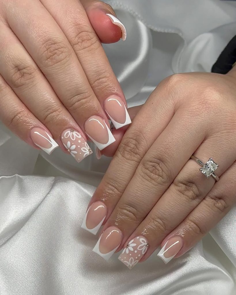 This manicure blends classic structure with playful detailing. A glossy French base on a square shape is softened by hand-drawn white florals on select nails. The balance between clean lines and organic motifs makes this look incredibly versatile. It pairs just as well with casual denim as it does with elegant evening wear. For women seeking fresh ideas that are not too far from the traditional, this design seems especially approachable for 2026.