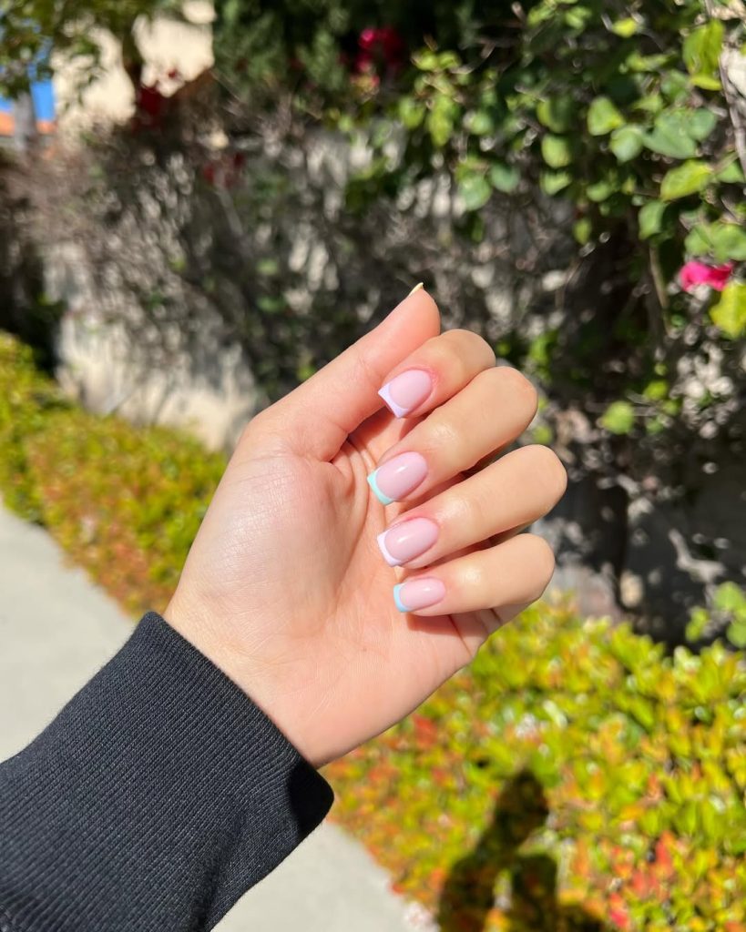 This look brings in spring freshness with a short silhouette and barely-there pastel blue French tips. The soft pink base creates a healthy, natural finish, while the muted blue adds a subtle pop of color without overpowering the design. In 2026, pastel French variations like this are becoming a go-to for women who want something seasonal yet timeless. It’s effortlessly simple and practical for everyday wear and especially flattering for minimal wardrobes and casual spring outfits.