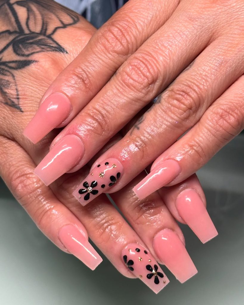 Here, a glossy pink coffin shape is paired with bold black floral artwork and tiny gold details. The contrast feels confident and modern, yet the overall execution remains polished rather than dramatic. This design suits women who love expressive ideas but still want a manicure that feels intentional and well-balanced. As spring 2026 trends lean toward contrast and controlled detail, this look fits perfectly—especially styled with monochrome outfits or structured denim.