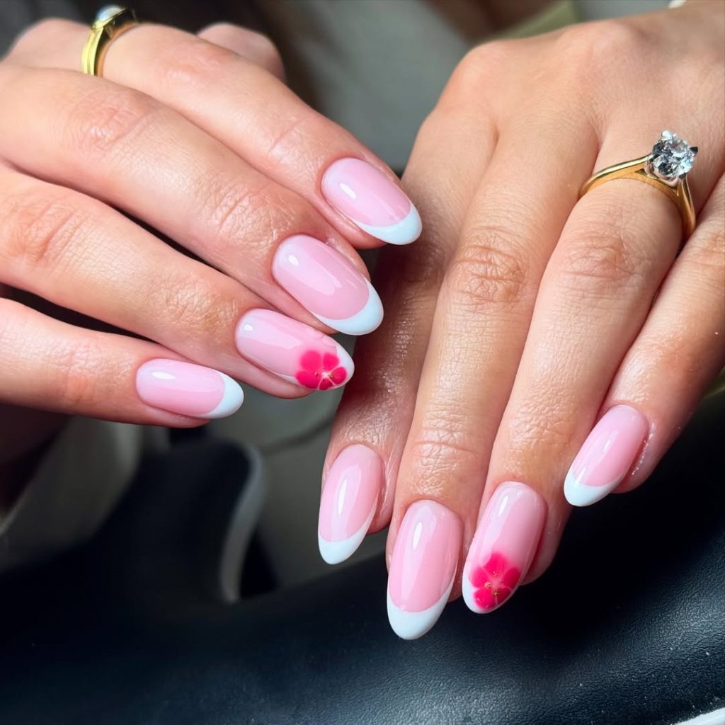 This French Mani Gets A Romantic Update The almond shape features a soft pink base, crisp white tips, and a single pink blossom accent. The floral detail feels delicate and symbolic rather than decorative, making the design ideal for women who prefer subtle femininity. This manicure aligns beautifully with spring 2026 ideas focused on softness and restraint. It pairs effortlessly with knitwear, silk, and light tailoring, offering timeless elegance without feeling predictable.