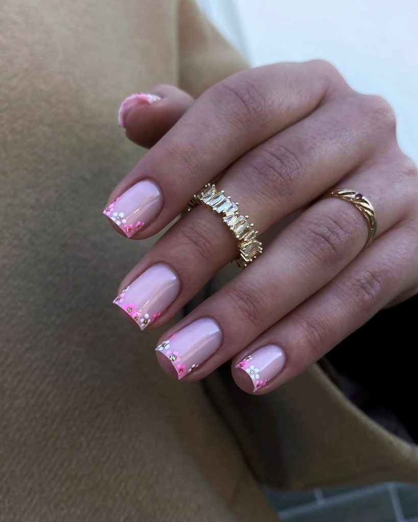 This manicure features a soft pink ombré effect on a square silhouette, finished with tiny floral accents that add just the right amount of detail. The gradient keeps the look fluid and feminine, while the square shape ensures a polished, contemporary feel. It’s a versatile design that works for both everyday wear and special occasions, aligning seamlessly with the refined yet expressive direction of spring 2026 nail trends.