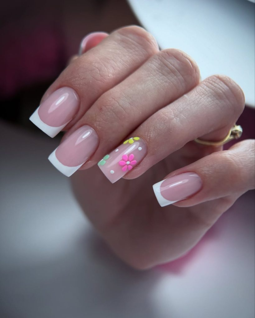This sleek manicure elevates the traditional square French with a soft blush base and a single playful daisy accent nail. The white tips remain crisp and clean, while the pastel floral detail introduces a youthful, spring-ready touch without compromising elegance. In classy spring nails 2026, this balance between structure and charm feels especially relevant. It’s a look that works beautifully for everyday wear, pairing effortlessly with knit tops, light denim, and neutral spring layers.