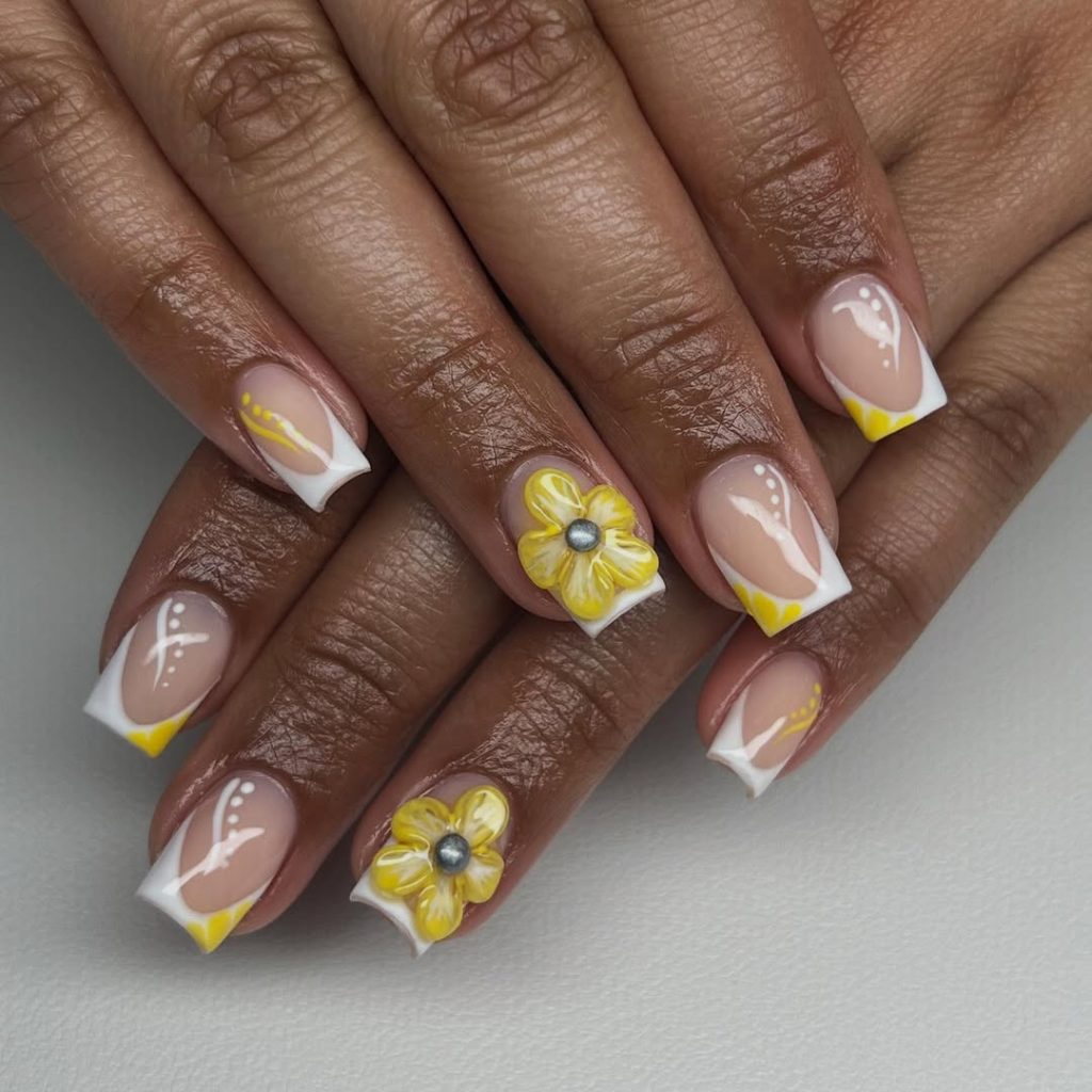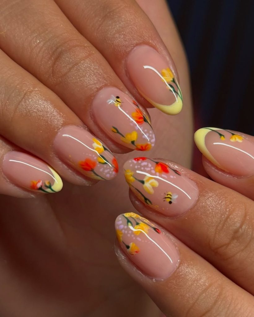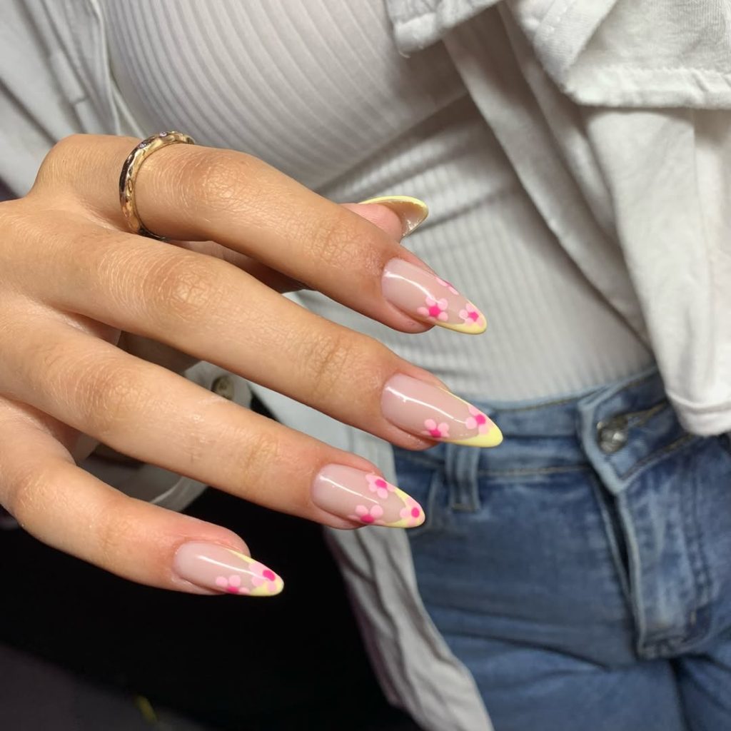 Almond Nude Nails With Yellow French And Hand-Painted Florals