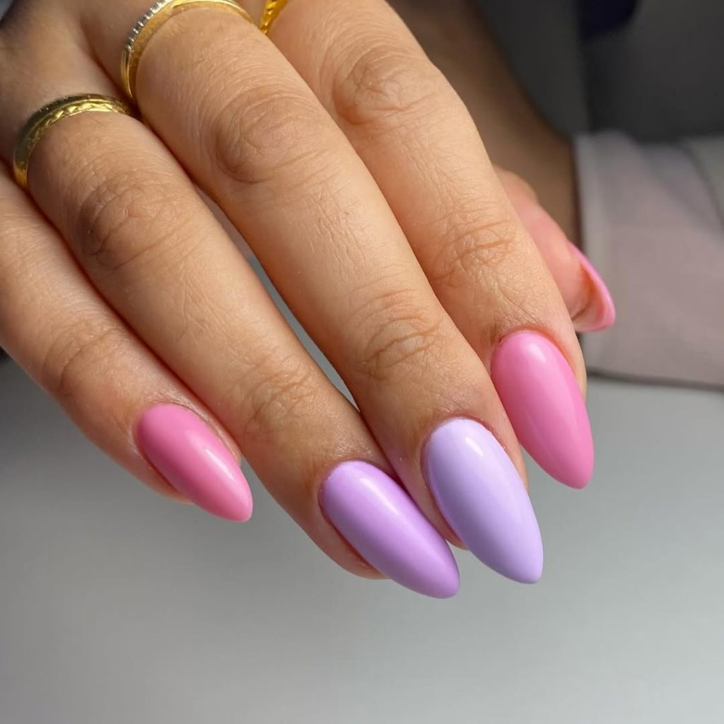 This almond-shaped manicure alternates between soft pink and lavender tones, creating a gentle contrast that feels modern and feminine. The glossy finish enhances the smooth silhouette, while the color pairing reflects one of the key 2026 trends: tonal harmony rather than bold contrast. This look is ideal for women who prefer clean designs with a subtle twist, and it pairs beautifully with both warm- and cool-toned spring wardrobes.