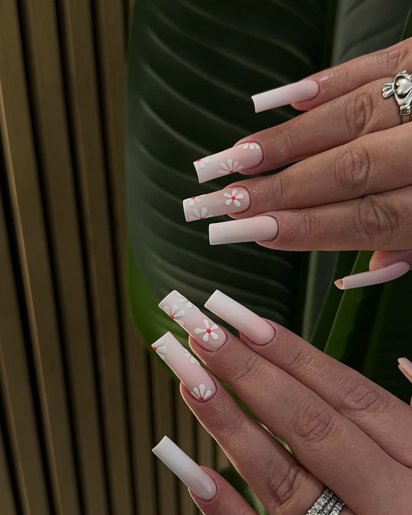 Long coffin nails in a matte blush finish provide a soft, velvety backdrop for delicate white floral artwork. The contrast between matte texture and fine detailing feels intentional and elevated, aligning perfectly with classy spring 2026-inspired styles. This manicure really stands out in natural lighting and can be worn with minimal clothing to let the nail art do its work; you do not want them looking busy or tacky.