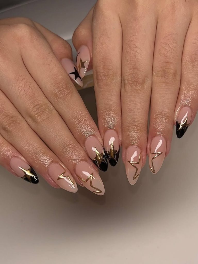 Nude Almond Stiletto With Black Tips And Gold Lightning Art
