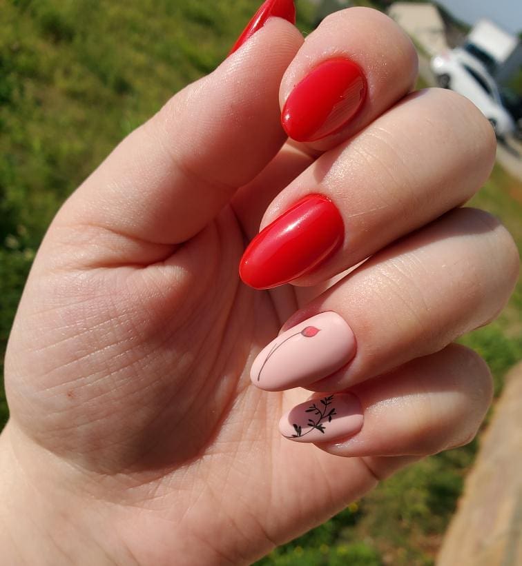 This look pairs a high-gloss red manicure with a soft nude accent nail detailed by a delicate floral line. The overall shape leans toward a classic almond, which instantly elevates the bold color and keeps it from feeling overpowering. While red isn’t always considered spring-forward, in 2026 ideas it’s reimagined as a confident neutral when balanced with subtle art. This manicure works beautifully with tailored outfits—think a crisp white blouse or a neutral trench—proving that chic doesn’t always call for subtlety. It is an excellent choice when it comes to designs that make a subtle, non-trendy statement.