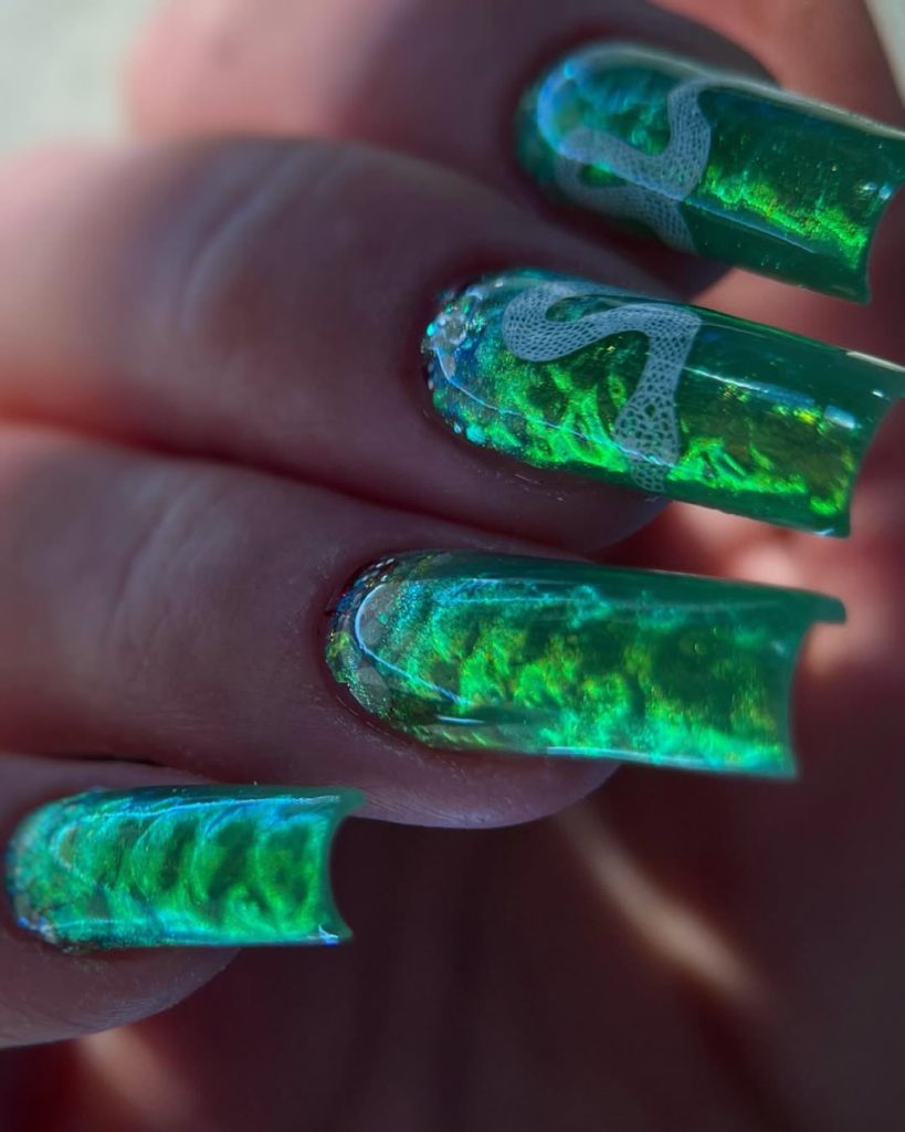 These nails feel bold, modern, and a little mysterious — in the best way. The deep teal-green base has a textured reptile effect that gives serious dimension, almost like a metallic mesh or scaled overlay. It’s the kind of manicure that gives cat eye vibes, not because of sparkle, but because of the shifting depth and light reflection.