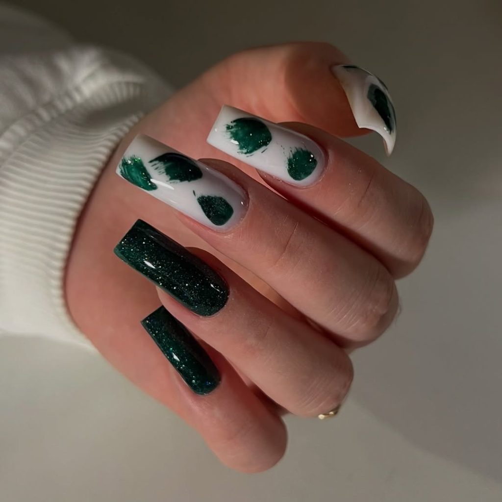This manicure mixes two moods beautifully: creamy white with deep green abstract placements, plus full glitter green statement nails. The contrast makes it playful, but the rich emerald shade keeps it chic. It’s the kind of set that feels perfect for early spring — when your wardrobe is still partly winter (coats, knits), but you’re craving color.