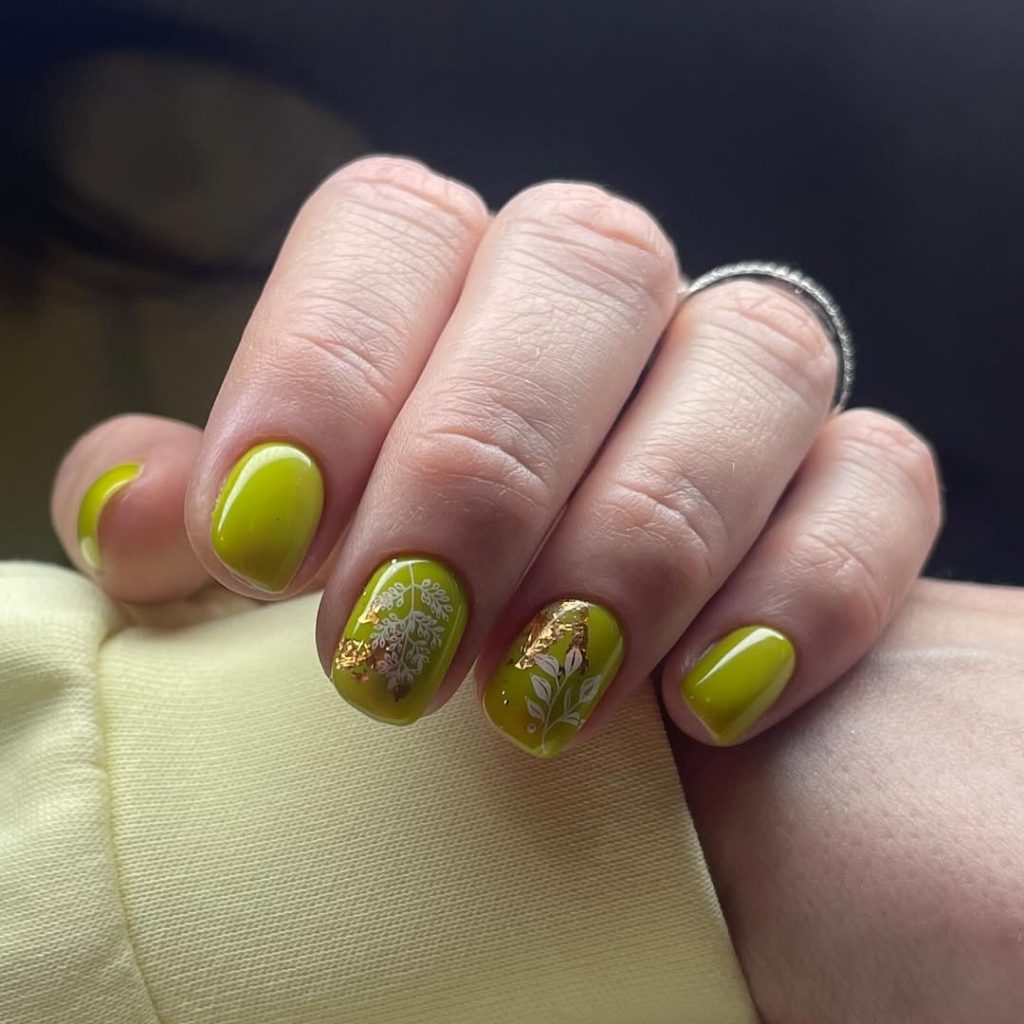 17) Glossy Olive Chartreuse Nails With White Botanical Art