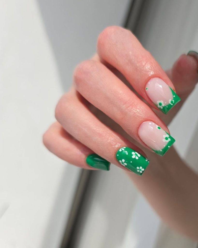 This manicure brings the joy back into spring. A nude base keeps it classic, while the crisp green tips turn it into a playful, modern french tip. The tiny daisy accents make the look with flowers without going overly sweet — it’s balanced, fresh, and very Pinterest-friendly.