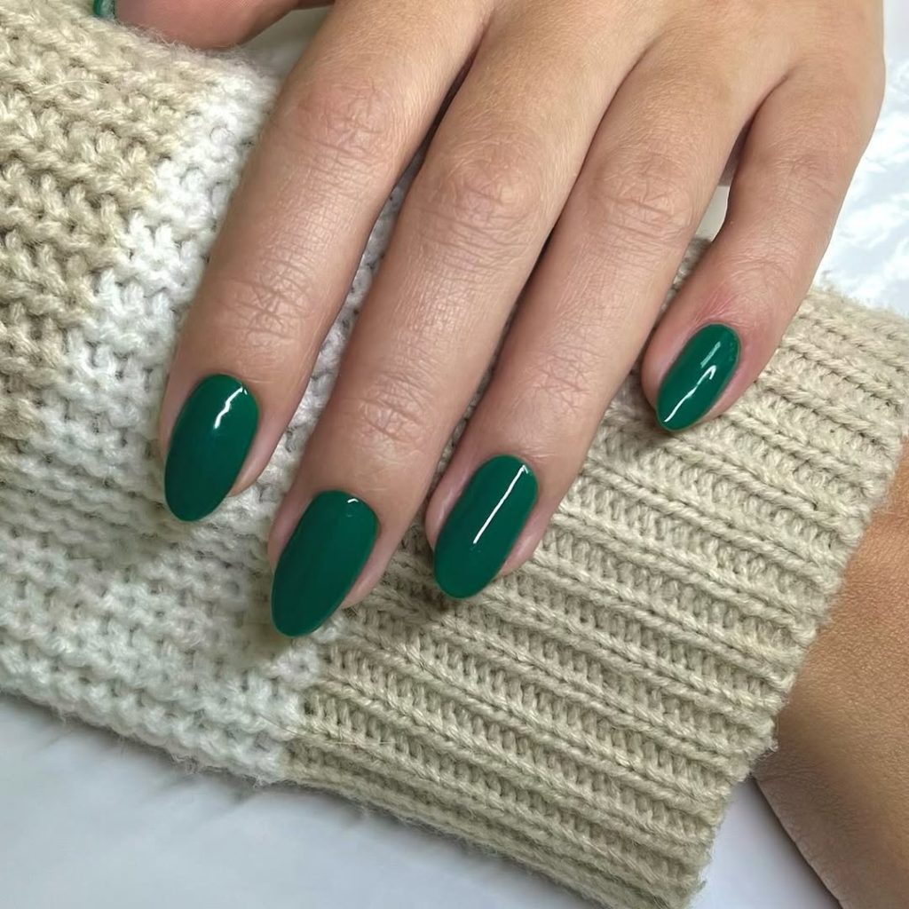 This look proves that spring nail colors 2026 aren’t only about pastels — deep tones are back in a chic way. The nails are shaped into a long, sleek almond silhouette, and every nail is coated in a rich deep forest green polish with a glassy, ultra-reflective finish. The color reads as luxurious and modern, almost like polished emerald stone, and the clean cuticle area makes the manicure feel expensive and salon-perfect. Styled with cozy knit textures and delicate rings, this shade becomes a statement while still being wearable — a perfect choice for anyone who wants a darker spring manicure that still feels fresh and refined.