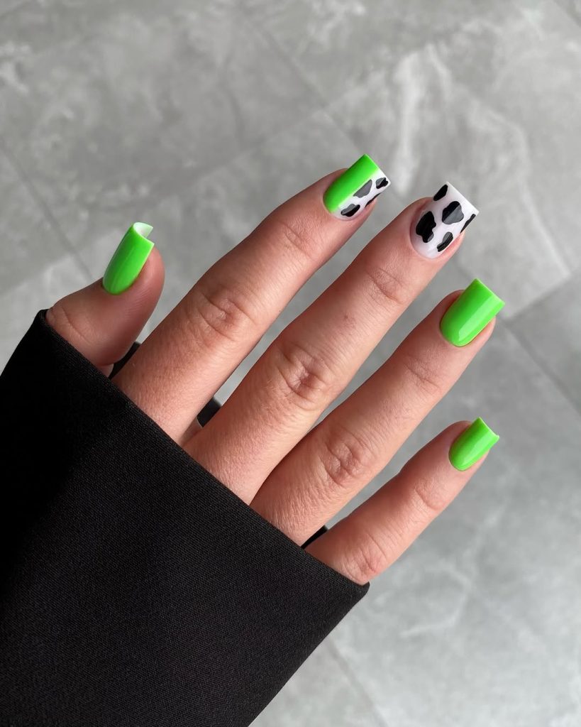 16) Neon Green Nails With Cow Print Accent