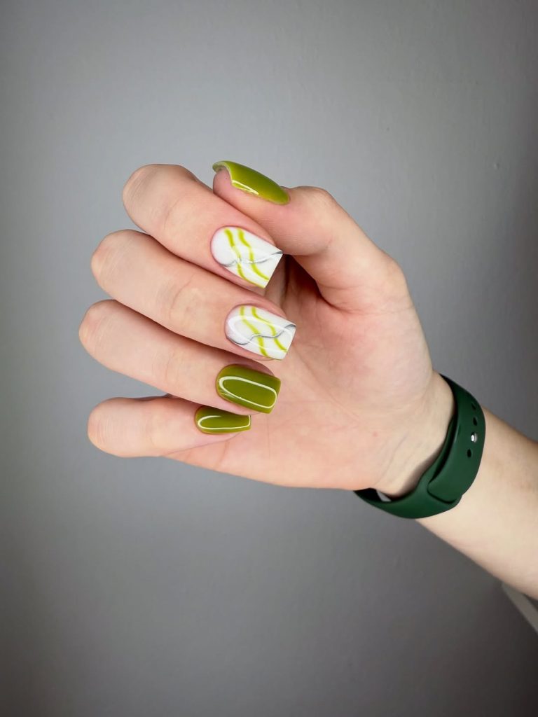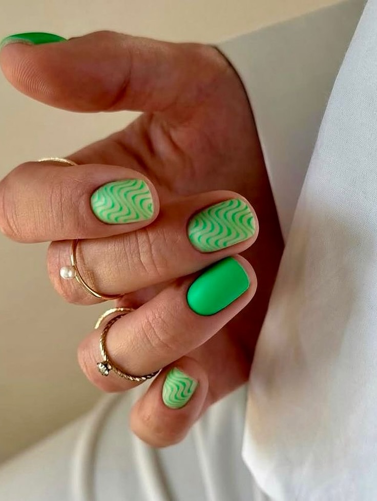 If there’s one vibe that screams “trendy but wearable,” it’s this mint swirl set. The nails are kept Short and rounded-square, with a modern matte finish on the solid green nails and a wavy swirl design on the others. The base is a creamy mint with darker green curved lines that create a groovy 70s ripple effect — the kind of manicure you’d match with gold stacking rings and a clean capsule wardrobe. This is exactly the kind of Cute nail art that feels youthful but not overly sweet.