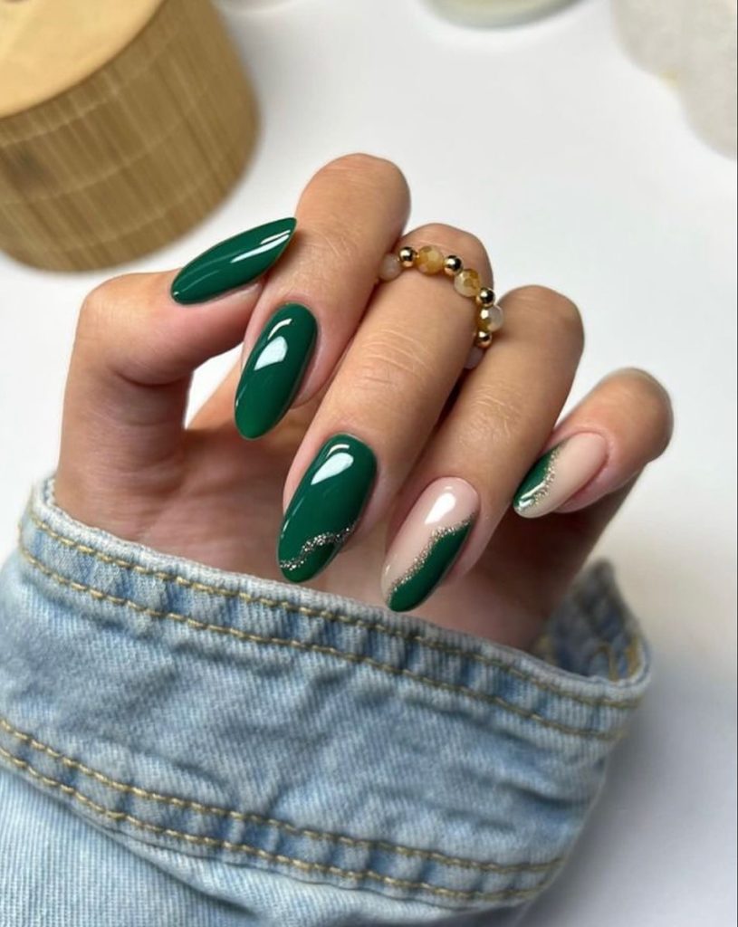 This look is a dream for anyone who wants green nails with a luxurious, fashion-forward twist. The deep green shade feels like the refined version of Dark Mint 2026 Designs — rich, glossy, and elegant rather than loud. The design plays with contrast: some nails are fully painted in shiny green, while others feature a nude base with angled green tips outlined in a thin glitter border. It’s not your traditional french tip — it’s the modern 2026 version, sleek and slightly edgy.