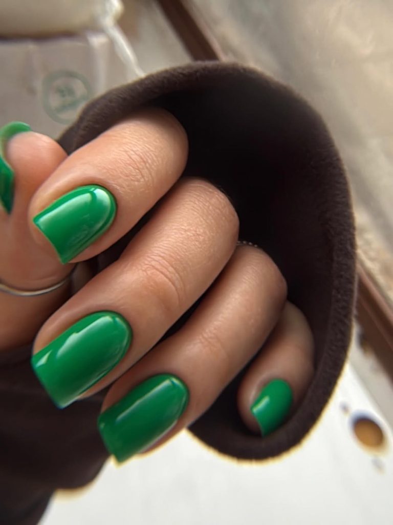 Sometimes the most fashionable option is the simplest one. These glossy deep green nails are sleek, polished, and unmistakably confident. The color leans dark, but it still works for spring because it’s botanical — like fresh leaves after rain — rather than heavy or wintery.