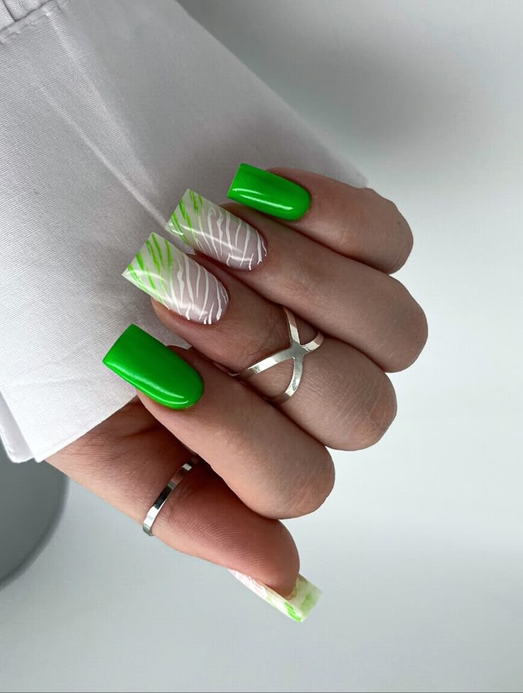 This look captures the bold side of 2026 Designs with a bright neon green that almost glows — the kind of shade that instantly makes your hands look more tan and your outfit look more intentional. The manicure is balanced with two statement nails featuring a sheer nude base and white zebra-style striping, plus a soft neon wash along the edges that mimics a modernized French tip. The shape is a clean Square with a glossy finish, which gives it that “fresh salon” vibe that lasts for days.