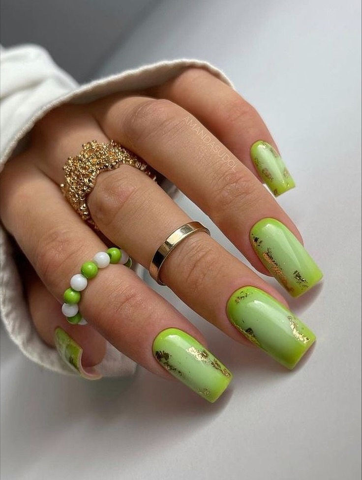 9) Lime Green Short Nails With Gold Foil + Botanical Art