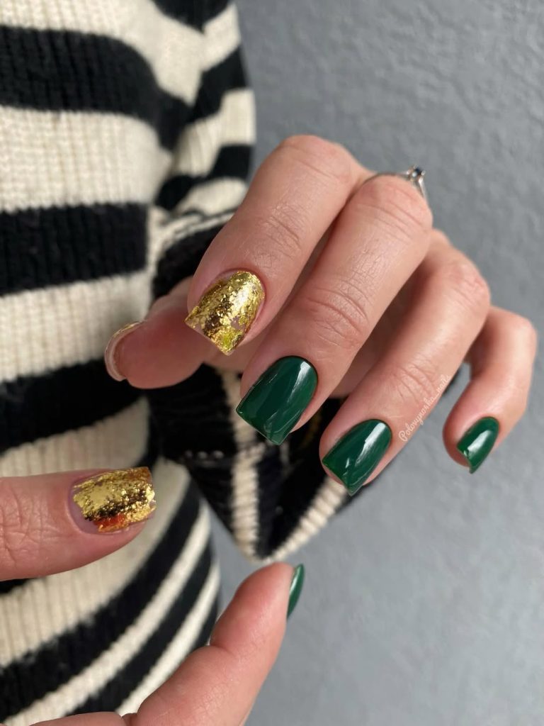 26) Dark Green Gloss + Gold Accent Nails