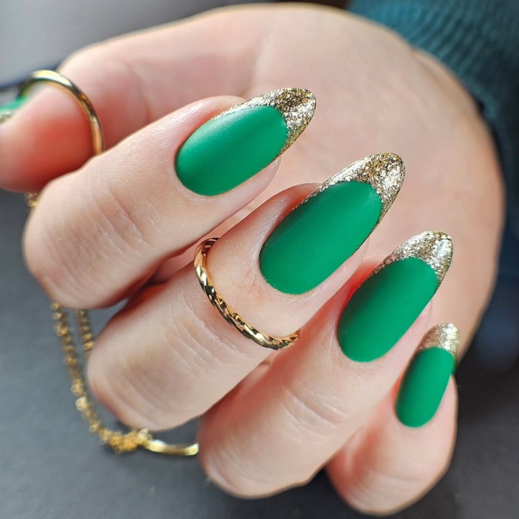 29) Emerald Matte Almond Nails With Gold Glitter French Tips