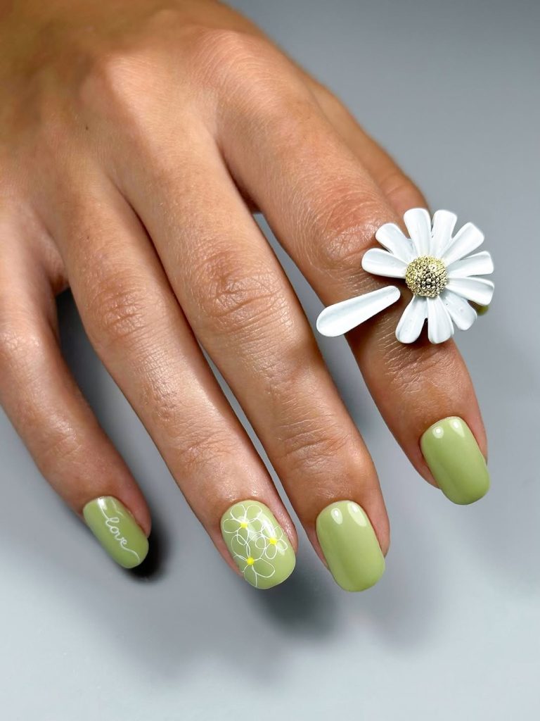 18) Light Sage Floral Nails With Minimal “Love” Detail