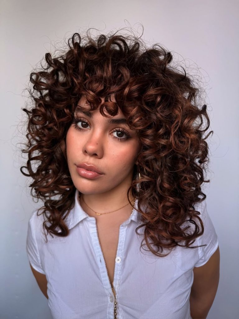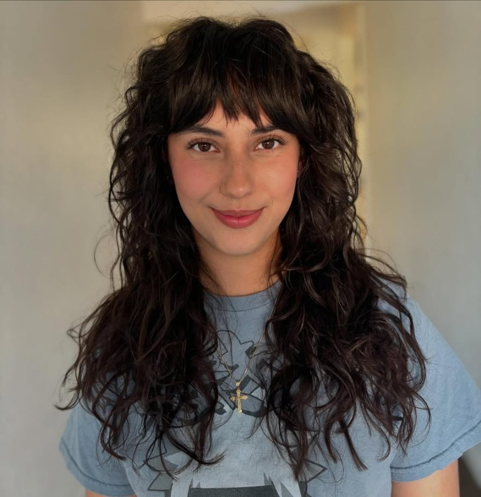 Voluminous, medium-length curly shag with bangs for high-impact texture