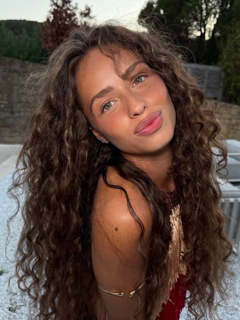 The raspberry-toned top gives the whole look that street-style snap: a simple base, elevated by hair and accessories. It’s also a reminder that when waves are this defined, you don’t need a complicated outfit to look pulled together.
