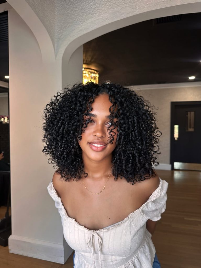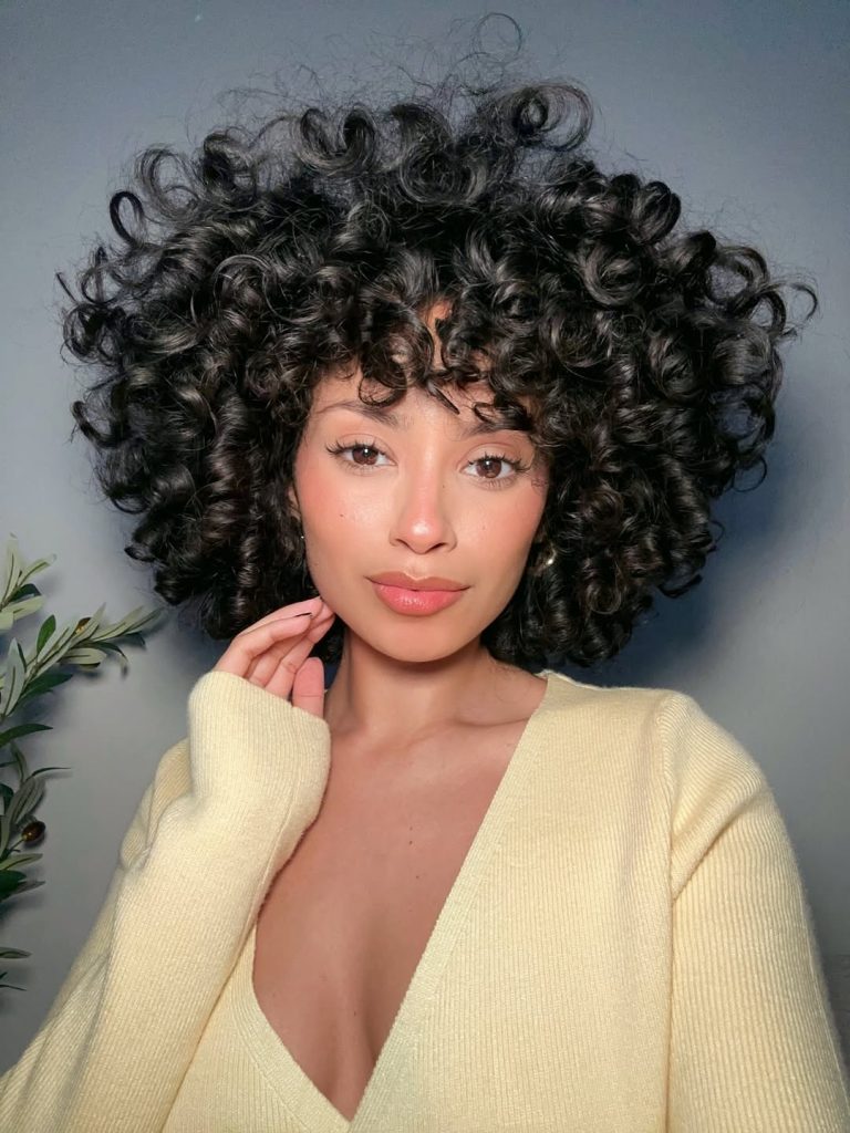 This is the big, rounded, editorial version of a curly bob—shorter through the sides with a halo of defined curls and a full curly fringe. Even if your natural pattern is more wavy than coily, the takeaway is the shape: a circular, lifted outline that makes texture look deliberate. It’s the kind of best choice when you want your hair to be the accessory.