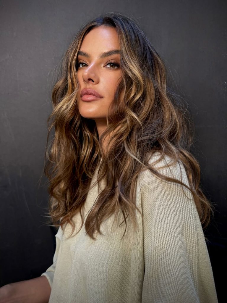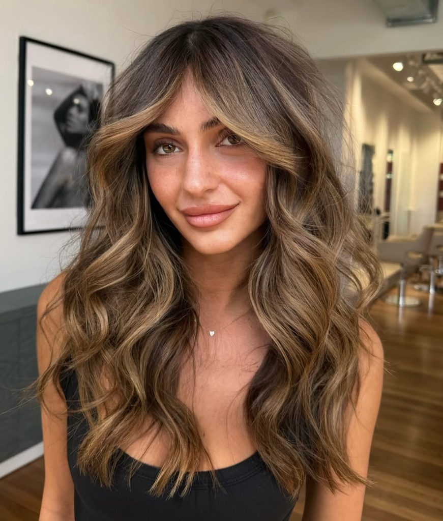 This look is the definition of “effortless, but expensive.” The base is a deep brunette, warmed up with caramel ribbons that sit brightest around the face and through the mid-lengths—exactly where movement shows most on wavy hair. The cut keeps the length generous (long) while adding soft, blended layers so the wave pattern falls in wide, relaxed bends instead of collapsing into a heavy sheet. It’s the kind of shape that grows out beautifully, which is why it’s a perennial favorite in salons for women who want polish without constant upkeep.