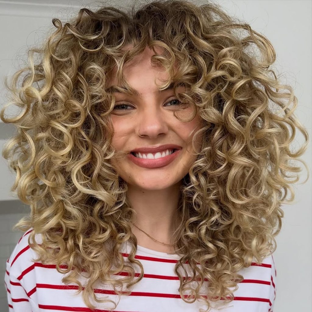 What to ask for at the salon: long, rounded layers throughout (so the curls stack instead of collapsing), plus soft, curly bangs that hit around brow level and blend at the temples. If you’re a woman with bangs but worry about styling, this is a smart compromise—short enough to look styled, textured enough to behave when you air-dry. It’s also a surprisingly good option for a round face or medium round face, because the fringe and cheekbone framing create angles without looking “severe.”