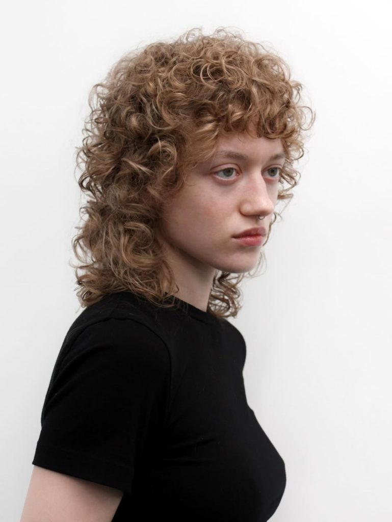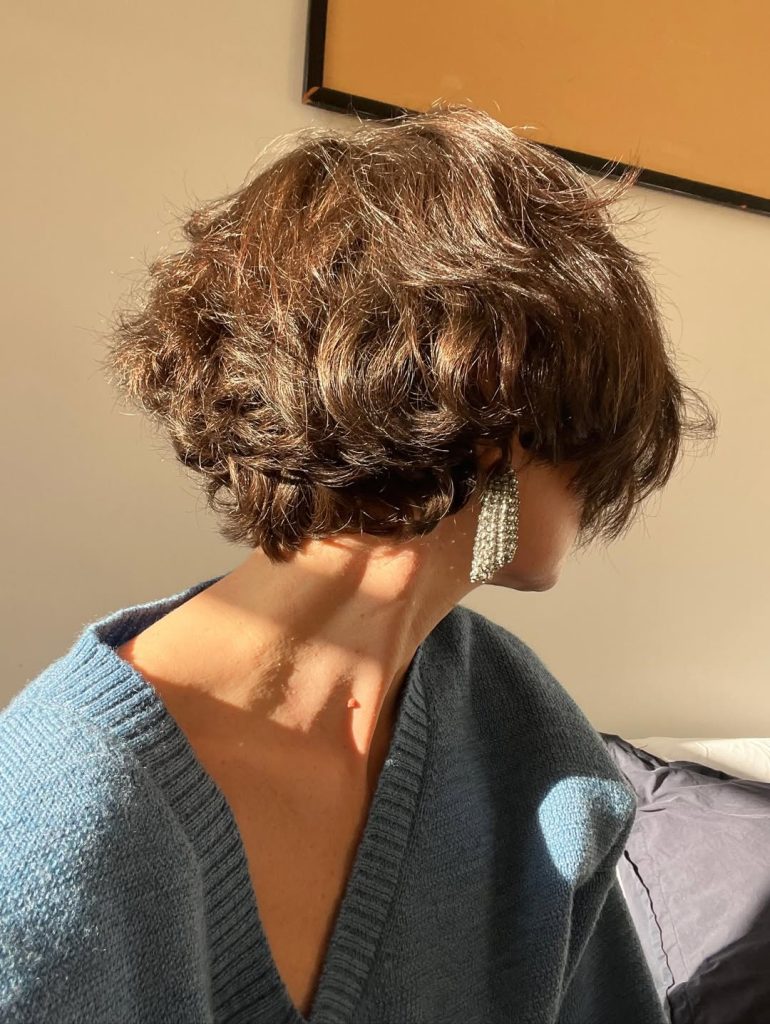 This one is for anyone who wants their waves/curls to look editorial without looking overdone. The cut plays with contrast: shorter, textured volume up top and through the crown, then more length left through the back—a very modern shag, with a wolf-cut attitude. The top is shaped with visible layers, and the front has a short, curly fringe that reads as bold bangs without turning into a blunt line.