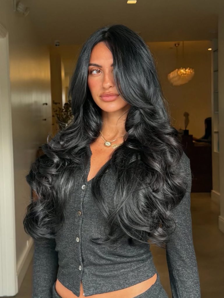The fitted charcoal cardigan keeps the vibe sleek and grown—perfect for women who want “glam hair” that still works for real life.