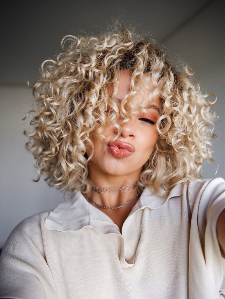 A curly bob doesn’t have to be prim—and this one proves it. The curls are tight, bright, and bouncy, cut into a rounded bob shape that sits in short territory while still feeling full and fluffy. The curls fall forward like a fringe, giving that “soft curtain” effect across the forehead—very woman with bangs, but in a way that’s light, modern, and texture-first.