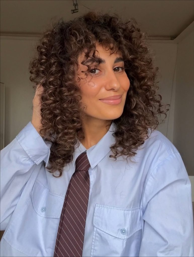 Curly hair and a crisp shirt-and-tie combo is a styling cheat code: texture keeps the look soft and approachable, while the outfit reads sharp and intentional. The hair sits around medium length, with defined curls and a full, curly fringe that gives unmistakable bangs energy. The shape is rounded and balanced, likely created with strategic layers that keep volume even on both sides while letting the curls spring.