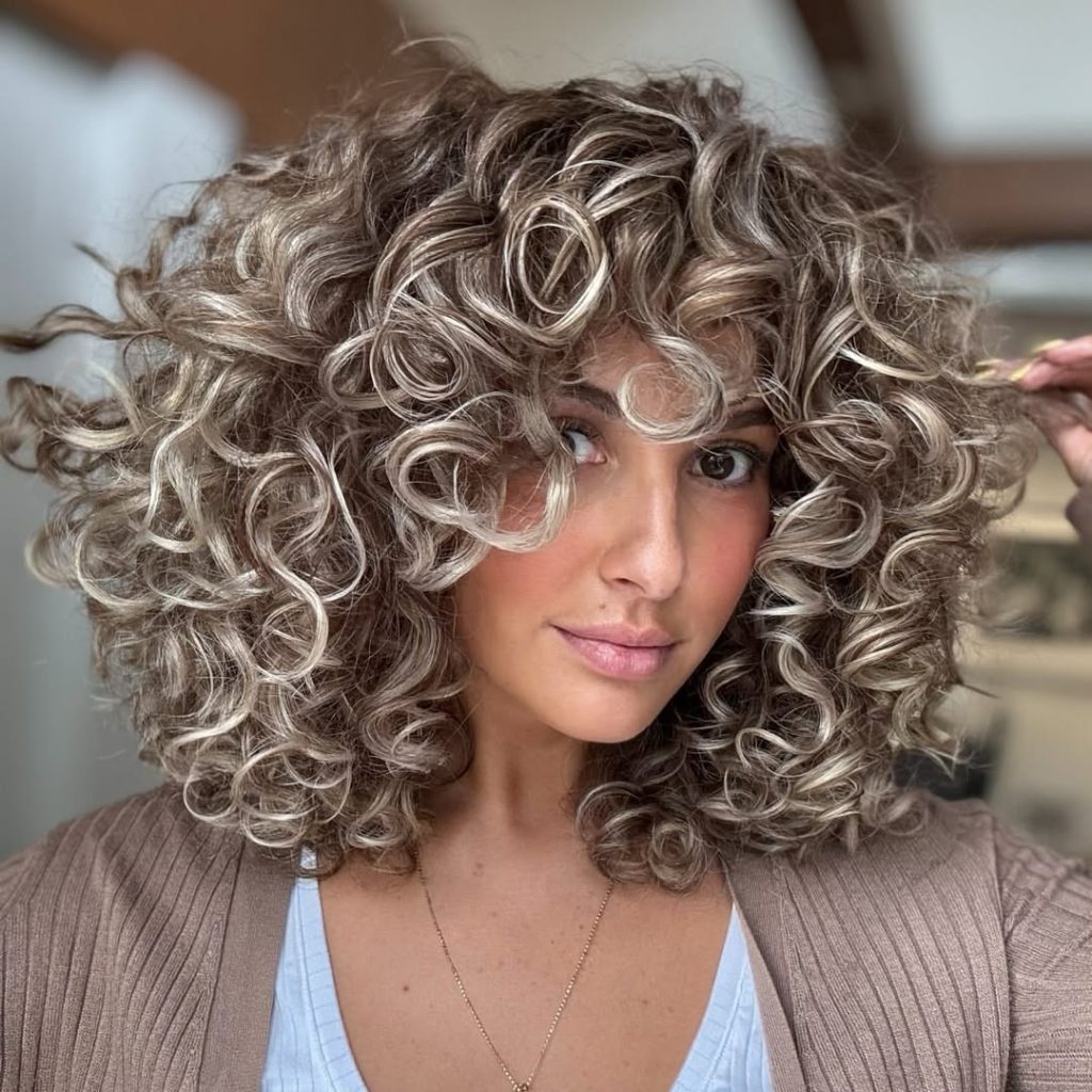 High-volume curls are having a moment, and this is the most wearable version: a rounded, full silhouette that frames the face like a halo. The length sits comfortably in medium-length territory, with plenty of internal shaping so the ringlets stack and spring rather than puff out randomly. The front has a natural curly fringe—real bangs energy, but with a curl texture that keeps it playful instead of heavy.