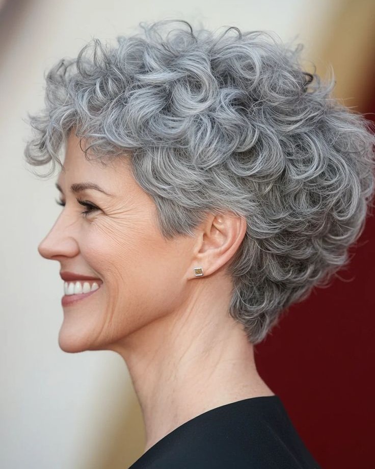 These silver curls are generous and cloud-like, with brightness and dimension that makes texture look luxe. The cut relies on long, rounded layers so the volume sits high without collapsing at the ends. Even if you’re technically “wavy,” this is a strong reference for how to build fullness without bulk: the shape is wide, but it’s controlled.