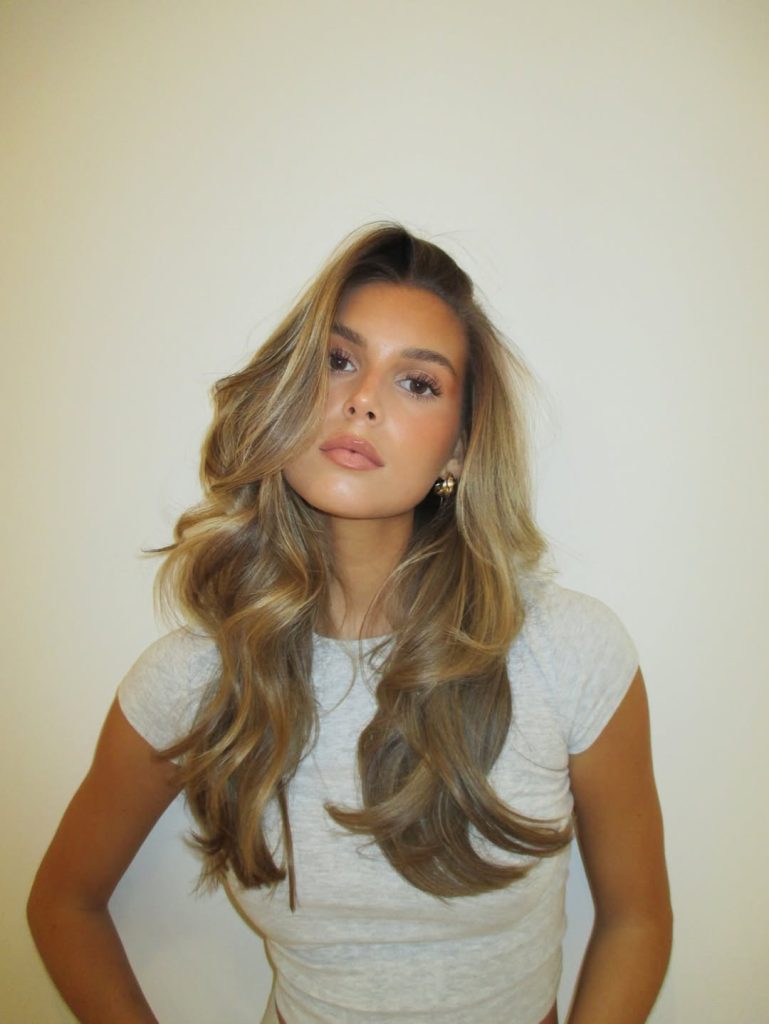 The sporty gray top keeps it modern and a little unexpected—athleisure meets glam hair, which honestly feels very now. It’s a reminder that you don’t need a dressy outfit for a high-impact look; sometimes the hair is the accessory.
