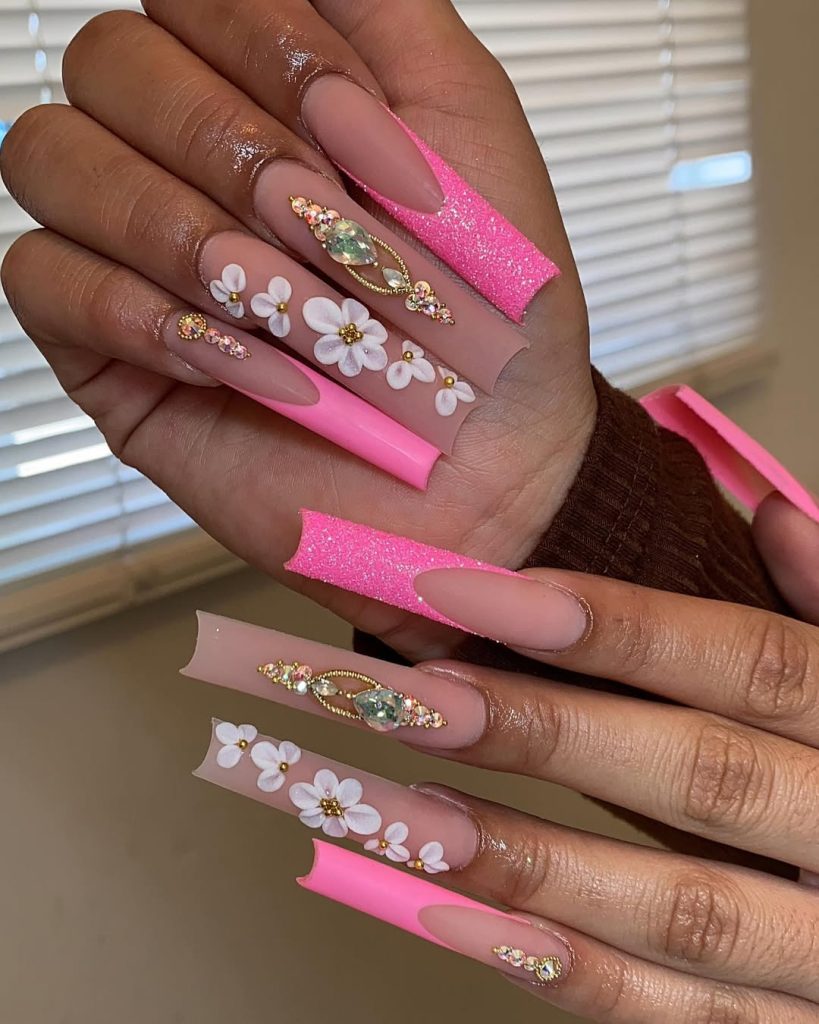Ask for: “Short square gel, hot-pink frame, hand-painted micro Flowers on a sheer-beige base.”