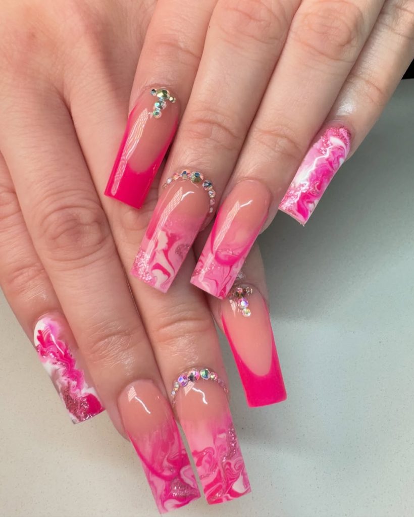 Think glossy pink marble poured over a nude base, punctuated by dainty crystal arcs. The squared-off length leans editorial while staying wearable. Ask for a gel marble created by diffusing white and fuchsia through clear, then cap with builder for that glassy dome.