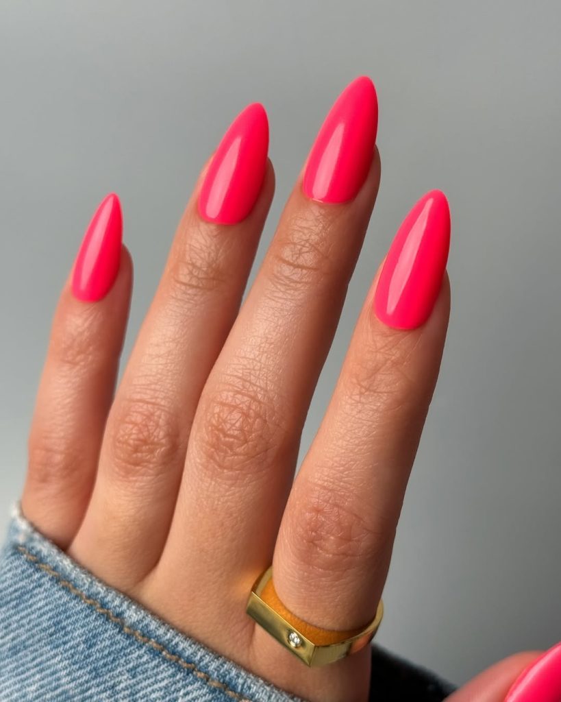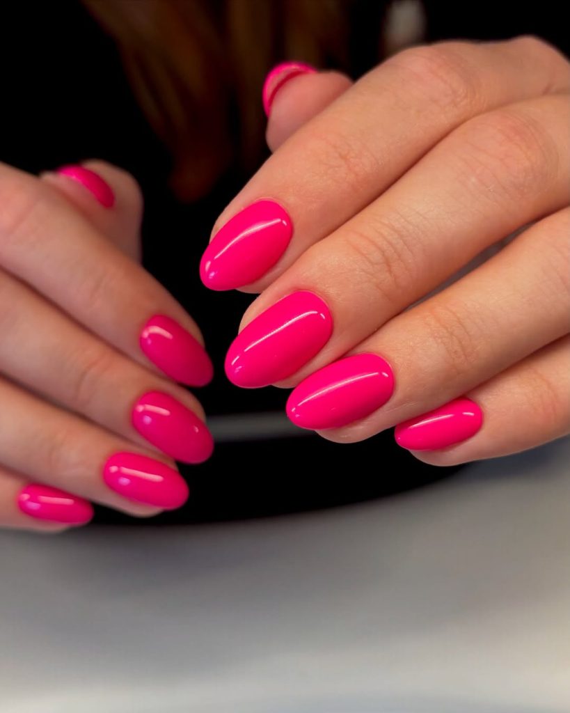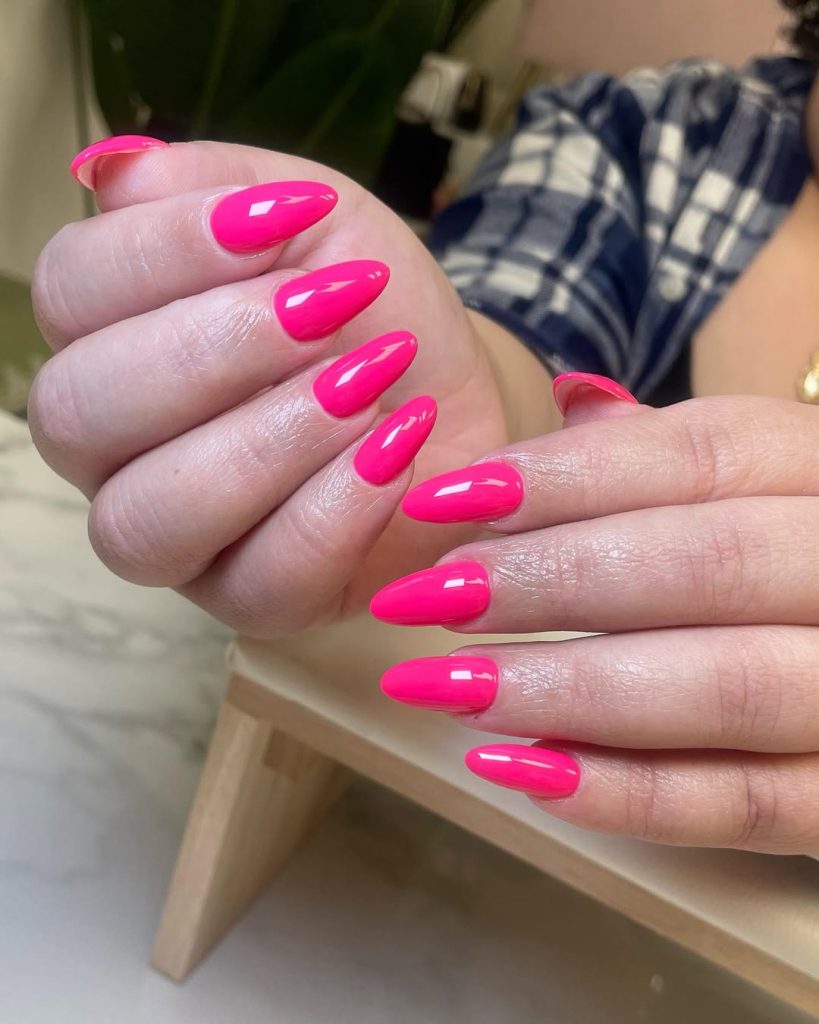 A saturated hot pink gel on a medium Almond shape —clean cuticles, even apex, and a mirror-like topcoat. The hue is vivid but office-friendly thanks to the balanced length and softly tapered sides.
