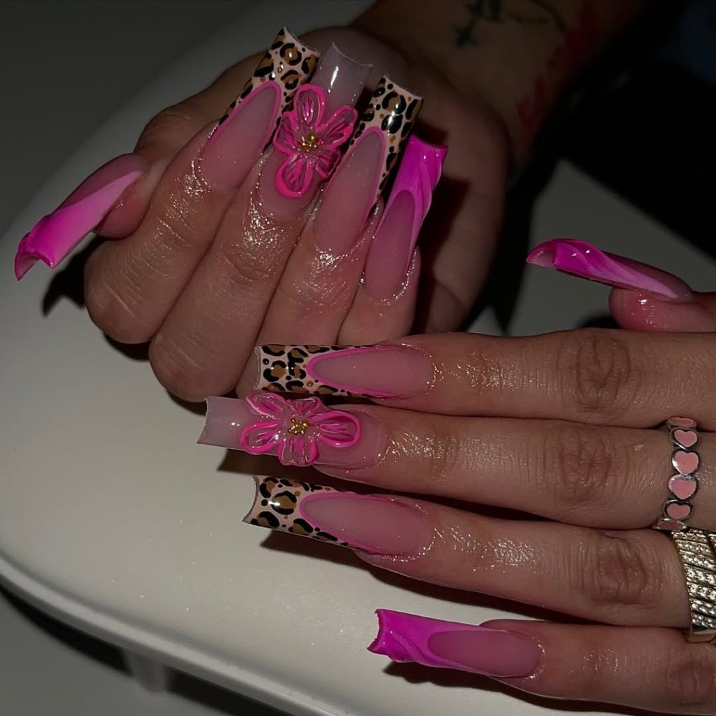 A playful mash-up: translucent pink sculpted tips, a single oversized 3D flower, and cheeky leopard panels. It’s the Black and hot-pink combo done right—more fashion than feline. Ask for a neutral base so the pattern and petals feel elevated, not busy.